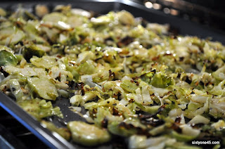 - Toss b/s in oilve oil, salt and pepper. Generously coast cookie sheet with olive oil.