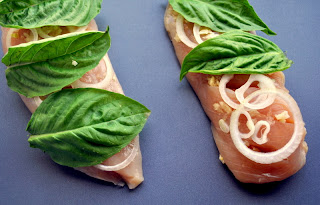 - Season the chicken with ½ teaspoon pepper. Lay sliced onion, chopped garlic and a basil leaf on each breast.