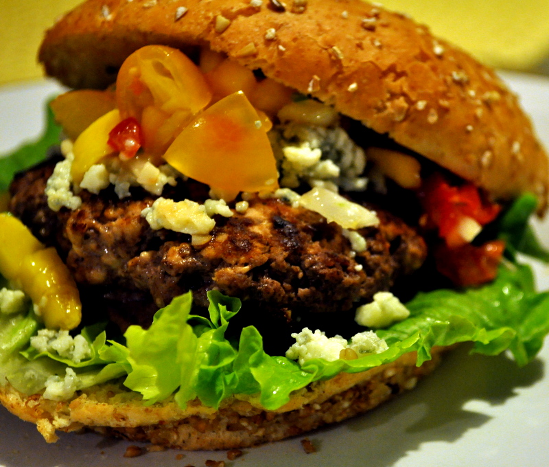 5. Assemble your burgers. We like our buns lightly toasted, so as the burgers are nearing done-ness, throw a very light layer of mayonnaise on the tops and bottoms and place on the grill until your preferred done-ness is reached. Place a piece of crisp lettuce on the bun, then the burger, followed by some crumbled strong cheese (we used smoked applewood blue), then the salsa. Put the lid on and enjoy....
