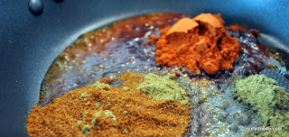 - While the meat is cooking, toast the spices. Add the olive oil to a small frying pan and then spoon in all the spices. Over medium heat stir them around until you get a fragrant paste. (careful not too long, or they burn) Maybe 3 - 5 minutes.