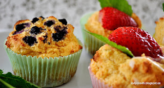 6. Place a few blueberries or one half strawberry on top of each muffin.