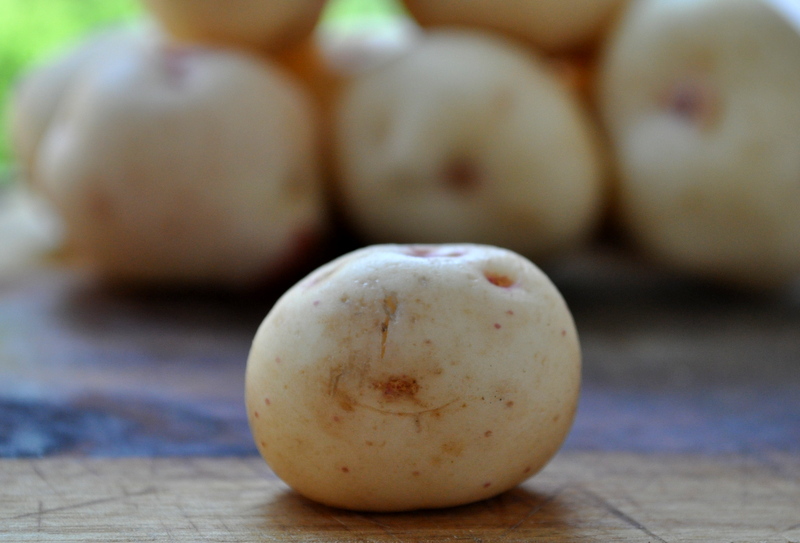 (if you look hard the 2nd one looks like he is smiling...poor thing doesn't know he's about to be wrapped, skewered & thrown on a grill) Because pa-TAH-toe sounds too fancy. And for something this fresh & straight from the dirt, I think Mother Nature says Poe-TAY-toe too. Stop by any farmers market or grocery store this month and you are bound to stumble upon these adorable little Warba Nugget potatoes.