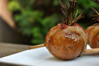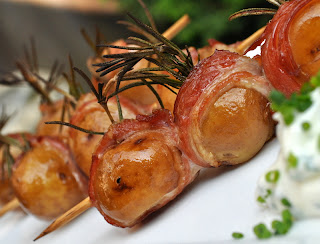 First, I (sorry hun) WE wrapped each nugget with a narrow strip of local Johnston's bacon and secured it with a rosemary twig inserted straight down into the potato. Put three of these nuggets on a skewer and off to a smoke filled grill for a couple hours. Because Little sixtyone45 loves to dip EVERYthing, we served it alongside a sour cream and chive dip.