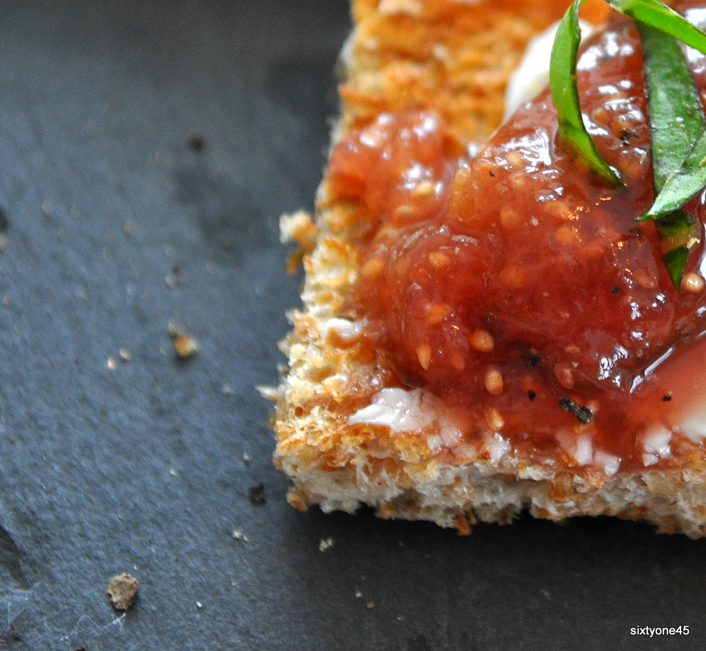 I used a ring mold to cut out some grainy, seedy (like sunflower, not like sketchy) bread I had. Then a dollop of creamy blue cheese. The jam comes next. Add a sliver of fresh basil from the garden (which is doing fantastically after I learned it does not like living next to tomatoes) and top it off with some cracked pepper.