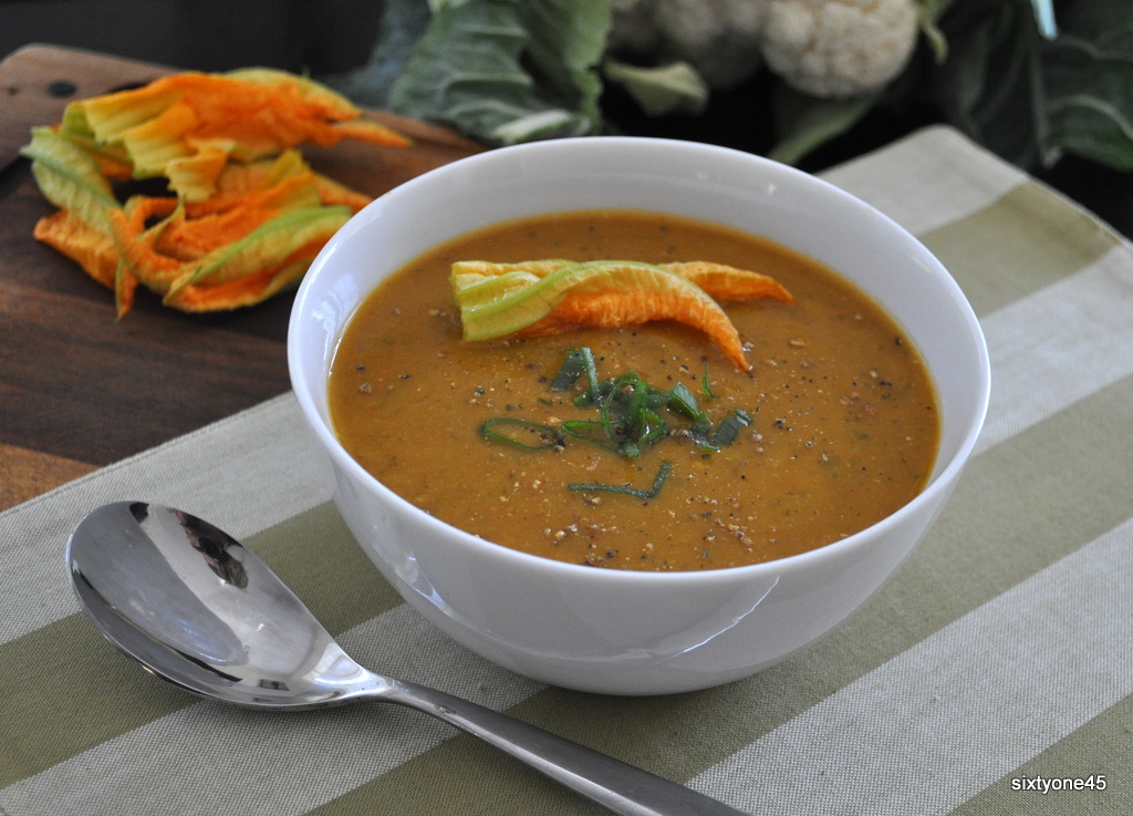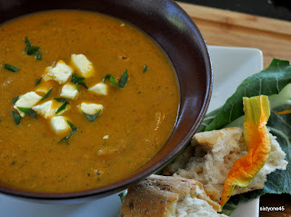 The Squash Blossom soup is a variation of the popular sopa de flor de calabaza (Mexican Soup) but without the heavy cream. It is straight veggies with the kick coming from a roasted poblano pepper. The apple gives it a bit of sweetness without any added sugar although a hint of Agave syrup would probably be nice.