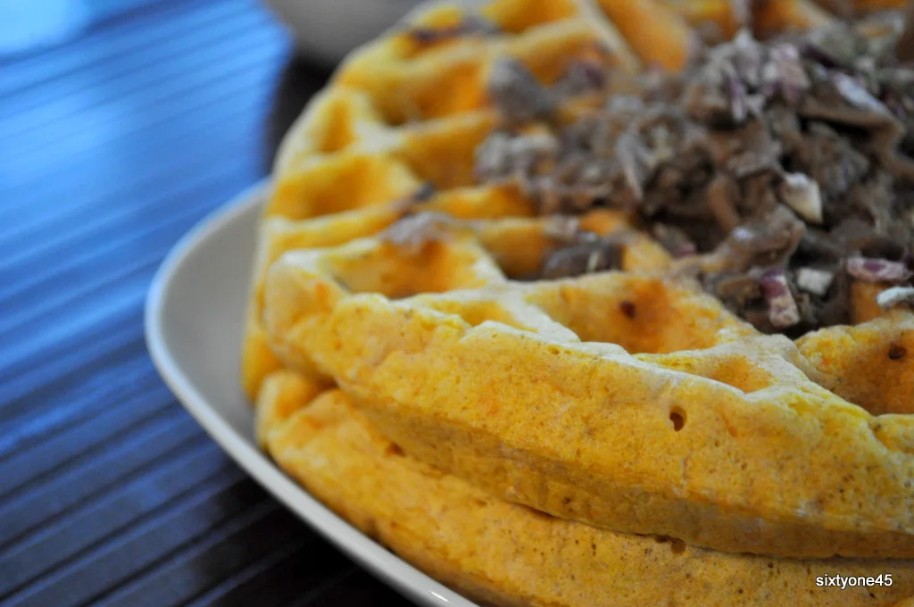 So the waffles. The waffles were inspired by a recipe in Edible Marin & Wine Country mag which was inspired by Bruce Aidells The Great Meat Cookbook. I like the idea of savoury waffles. I never make them. I will more often now. I think the waffle should be revived a little.