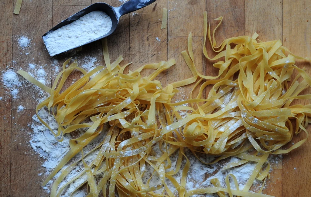 - Place the flour on the counter or a large board. Make a well in the middle and crack in the three fresh eggs. Using a fork, gradually work in the walls of the flour well until incorporated. (carefully so the walls do not break and the egg over flows, use a large bowl if preferred)